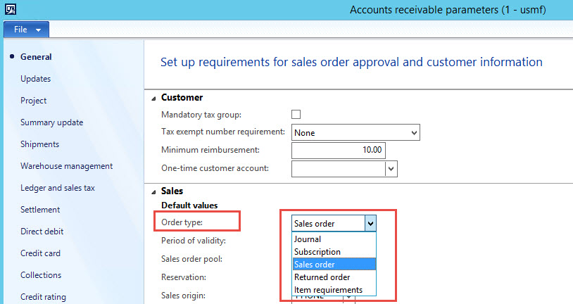 Accounts Receivable Parameters – Order type April 23, 2015 · by Lachlan Cash · in Accounts receivable, Sales and marketing. · When you create a sales order it’s defaulted to an Order Type. This type is defaulted from the Accounts Receivable parameters. You can find this under the General\Sales tabs. Cheers Lachlan Share this: Click to email a link to a friend (Opens in new window) Email Click to share on LinkedIn (Opens in new window) LinkedIn Click to share on X (Opens in new window) X Click to share on Facebook (Opens in new window) Facebook Click to share on Pinterest (Opens in new window) Pinterest Click to share on Tumblr (Opens in new window) Tumblr Click to share on Reddit (Opens in new window) Reddit Like Loading... Related