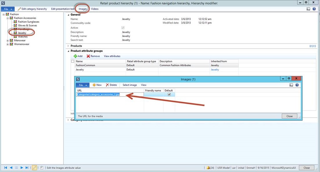 In order to set that open up your category heirachies – remembering that the “Retail Category Heirachy” is what typically sets your product range over all, and has detailed sub nodes normally – however with AX, we have the option of creating multiple category heirachies. In our Demo Data, the Retail Navagation Heirachy is what is considered the “External Facing” heirachy used by ECOM and MPOS etc. So for this example, and the way our demo data is set, open the Retail Navagation Heirachy and position on the fashion accessory Jewlery. (Note here that I have opend the images menu from the top and here I can see the folder in which the “Default” category image for MPOS is being displayed.