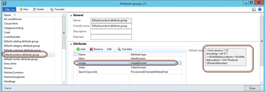 Attribute Groups – note for the image attribute, the sub directory of products/{productNumber} have been set.