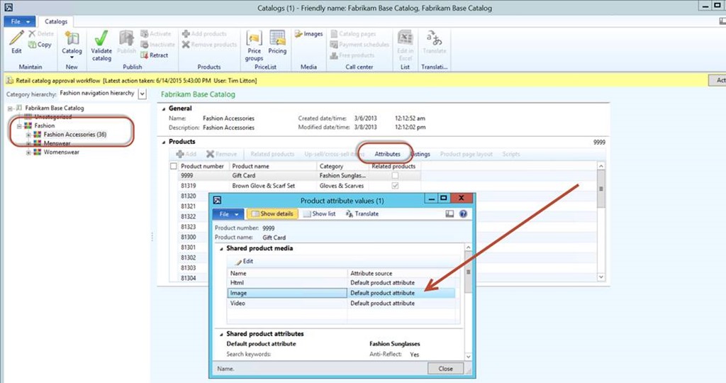 Now lets view the catalgoue for Fabrikham – follow menu path “Retail – Catalogue” now position on the fabrikham base cataloge. Here you see the default product attributes being assigned.