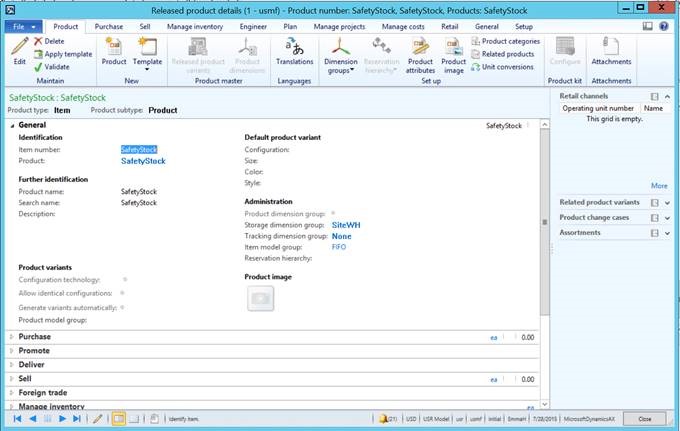 1. For this example, I have created a new inventory item and I have called it Safety Stock. I have simply used the default settings for storage and tracking dimension groups – stocked the item in each’s and set item coverage for site 1 warehouse 11 as requirement.