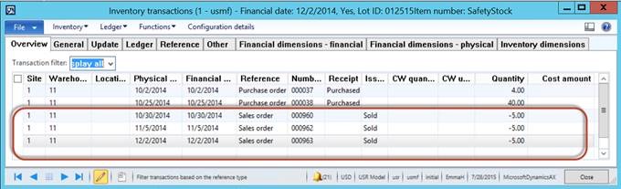 2. You must have “Issue” transactions for the period you are planning on running the safety stock journal for. A review of this example above analyzes the inventory transactions – note below transactions for October, November and December only for this item.