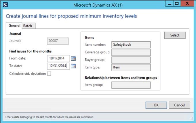 4. To process the safety stock journal, navigate to master planning – journals – safety stock journal and create a new journal header – then select lines. Once in the journal, you can select Journal from the options and select create lines. The below example shows that I am looking for issue transactions over a 3 month period – from October 1st until December 2014 (Note I have selected these dates simply because of demo data – generally speaking you will select the most recent history