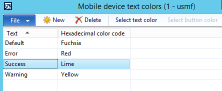 If you are looking to setup the warehouse mobile device portal in a post the other day we had a look of changing the text colors from the application. Below is a bit more details about how the colors are used. There are only 4 settings, Default, Error, Success, Warning.