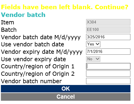 There are certain places where warning will be displayed. For example when working with batch, batch disposition codes, potency, vendor batch details. The warning is used to indicate optional data or data this user might want to check again.